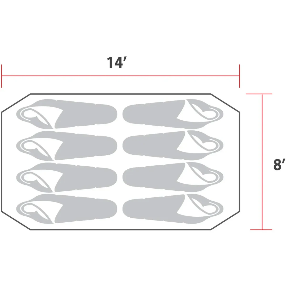 - Dimensions: 14′ L x 8′ W x 5’10” H (4.3 x 2.4 x 1.8 m)