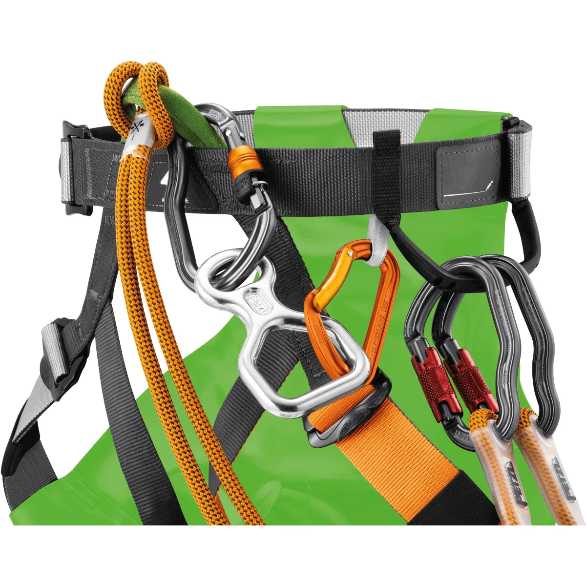 - Materials include high-strength polyester webbing, a thermoplastic polyurethane seat, polyester attachment points and steel buckles