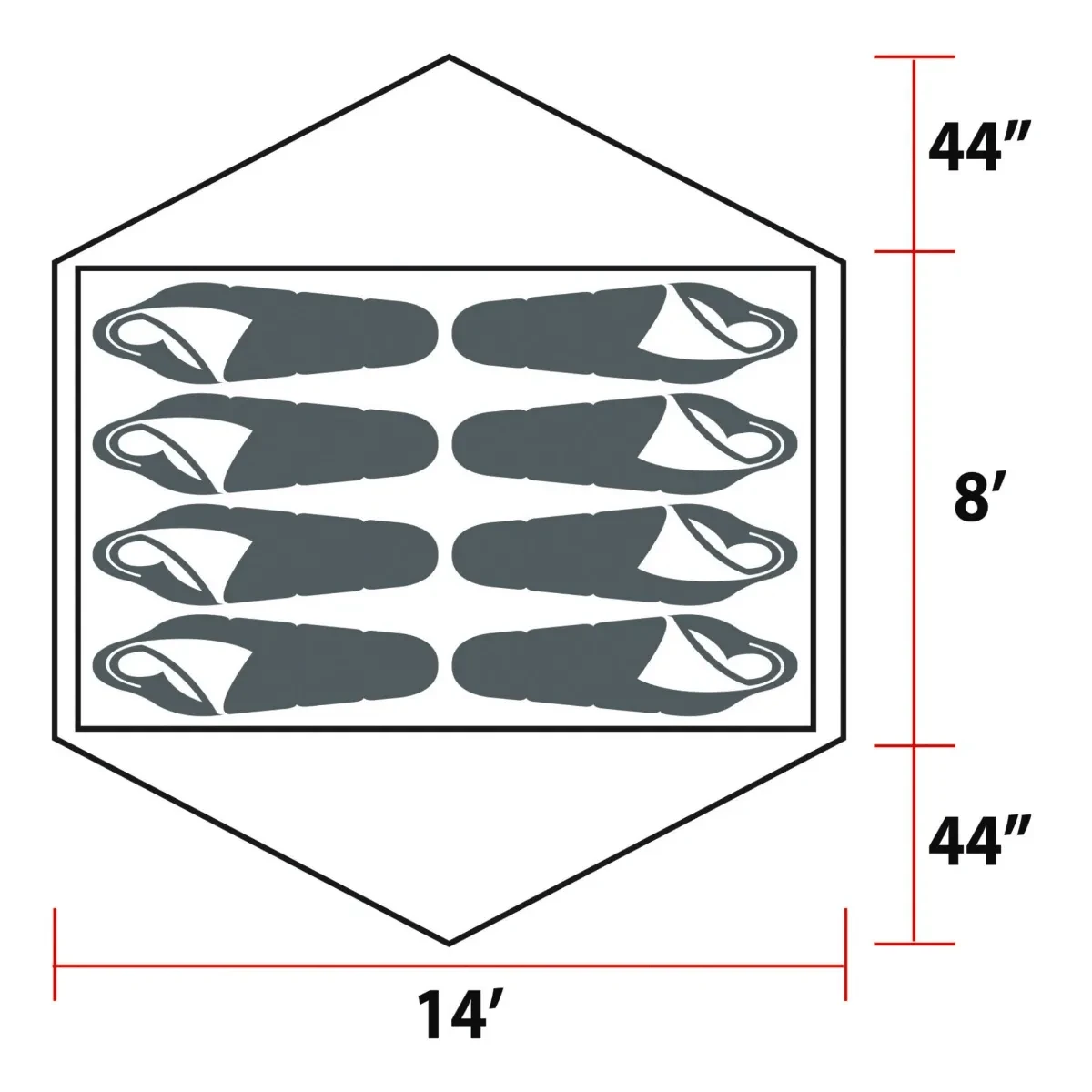 - Tent dimensions: 14′ x 8′ x 6’6″ (4.3 x 2.4 x 1.9 m)